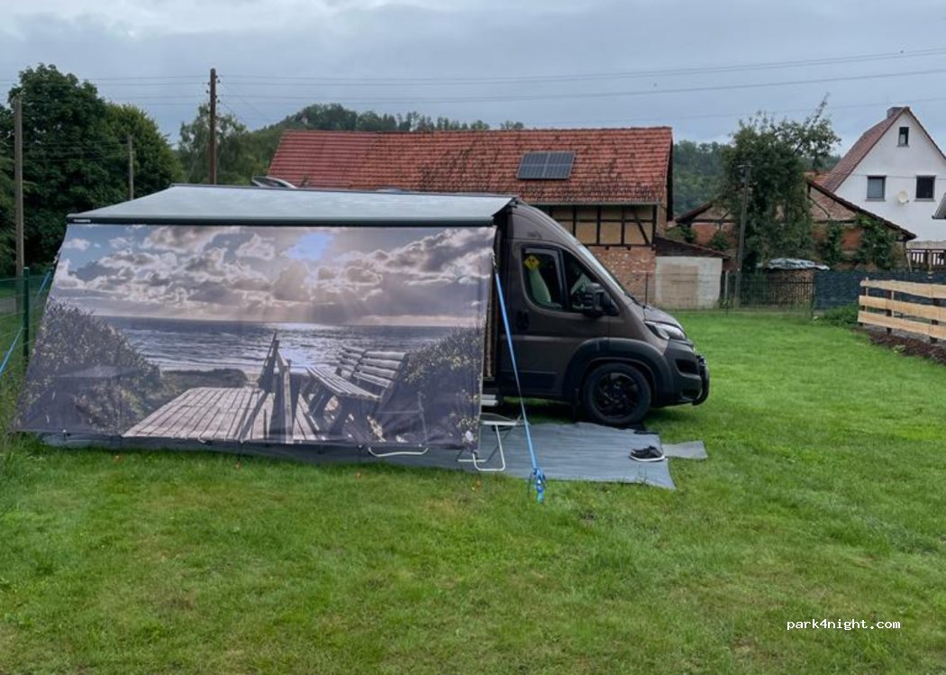 Nous proposons 3 places de parking pour camping-cars jusqu'à 6,50 m sur notre propriété privée en campagne à 50 m de la Werra. Il y a une taverne forestière, un espace barbecue et des toilettes sèches séparées sur place. A proximité immédiate se trouvent une boulangerie, un café et une petite brasserie. Nous organisons nous-mêmes des excursions en bateau pneumatique et en canoë gonflable sur la Werra.
