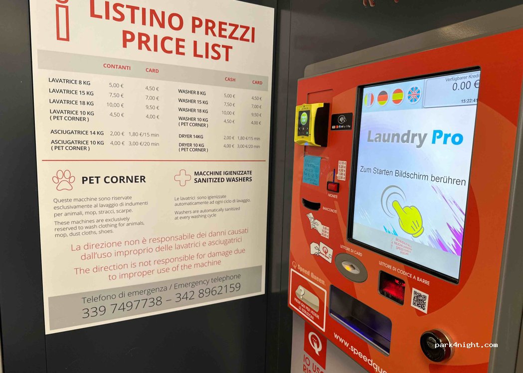 Haben dort heute eine Maschine Buntwäsche gewaschen. Funktion ist mehrsprachig erklärt. Bezahlung mit Münzen oder Karte. Wäsche wurde sehr sauber und roch angenehm. 1 Pkt Abzug, da sämtliche Trockner defekt waren. Es war etwas umständlich mit dem Camper einen Platz zum Trocknen zu finden.