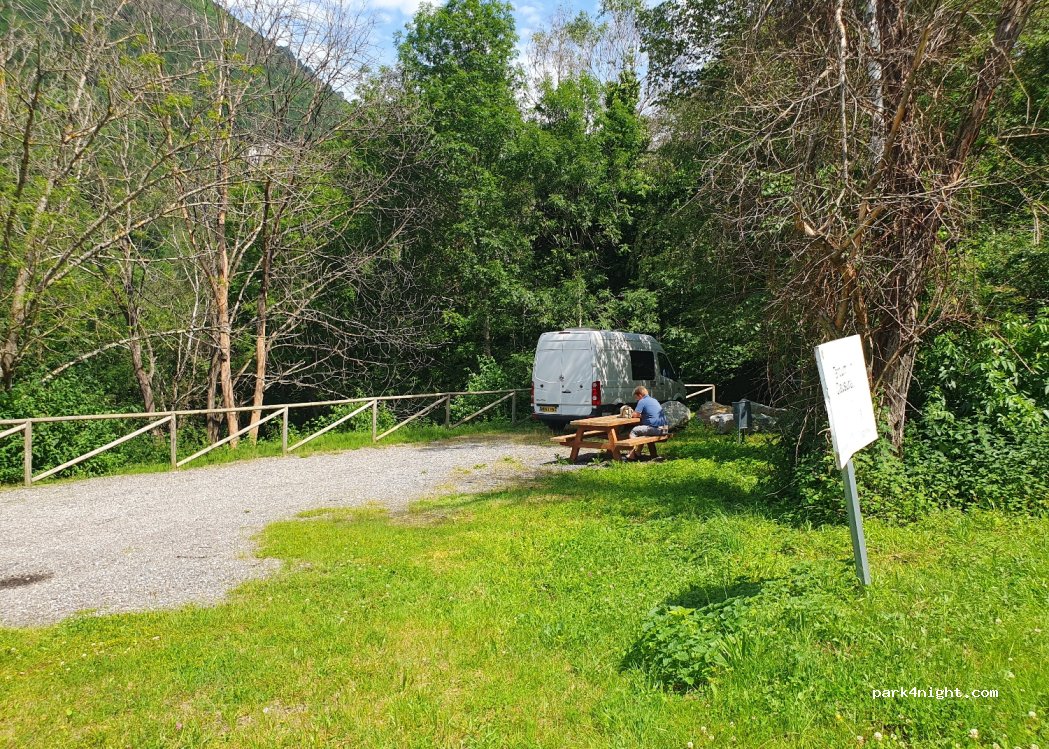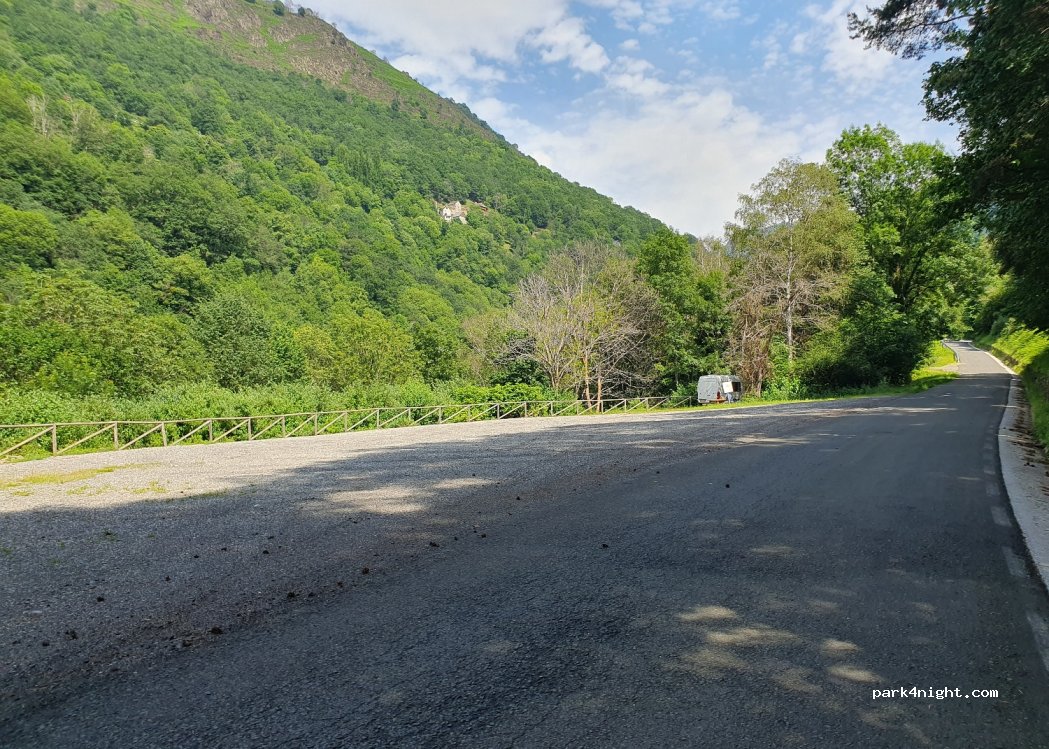 Très belle vue sur la montagne et le village de canejan. Ce n'est pas une turbine que l'on entend mais un transformateur électrique le bruit est minime, nous avons plus profité du bruit du torrent n'est ce pas le charme de la montagne ? Il y a une table et une poubelle. Grand CC route sinueuse