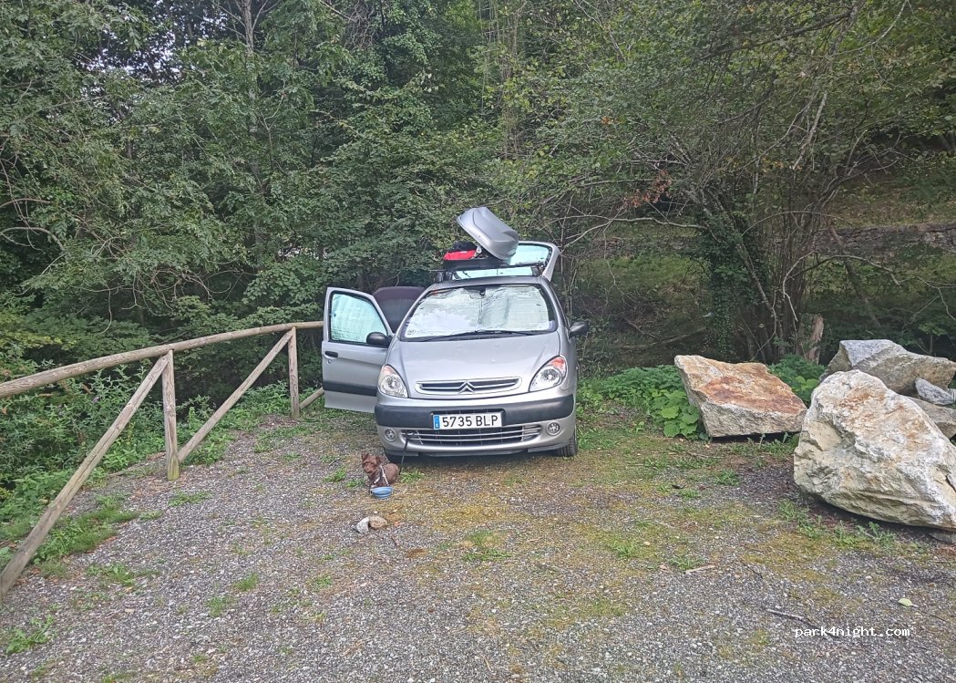 Molt a prop de la carretera. Terra de grava una mica inclinat. Entorn bonic però no pots sortir de l'aparcament.