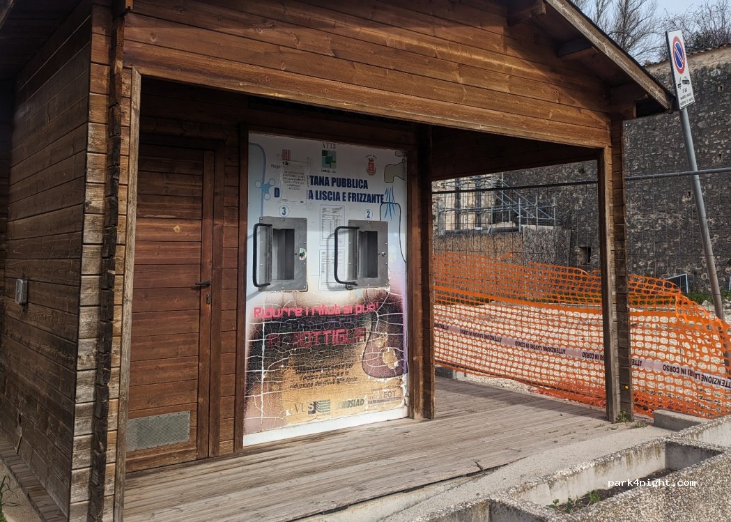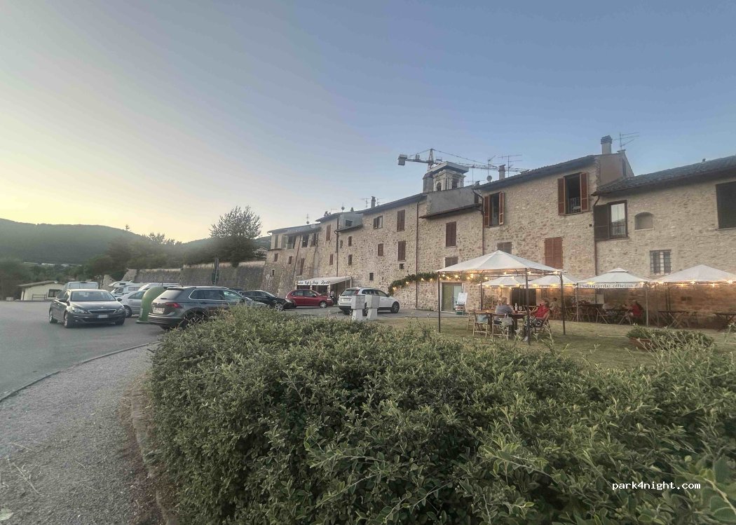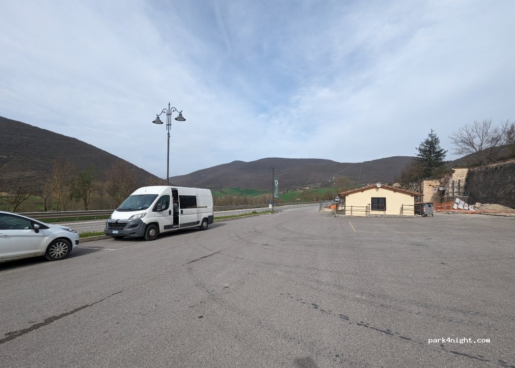 Ampio parcheggio auto, proprio dietro le mura del paese. Un po’ in pendenza. Rumori di auto, stando proprio sulla strada. Rumori verso le 5 del mattino per i netturbini e dalle 6.30 in poi i pullman per le scuole. Tutto sommato nottata tranquilla.