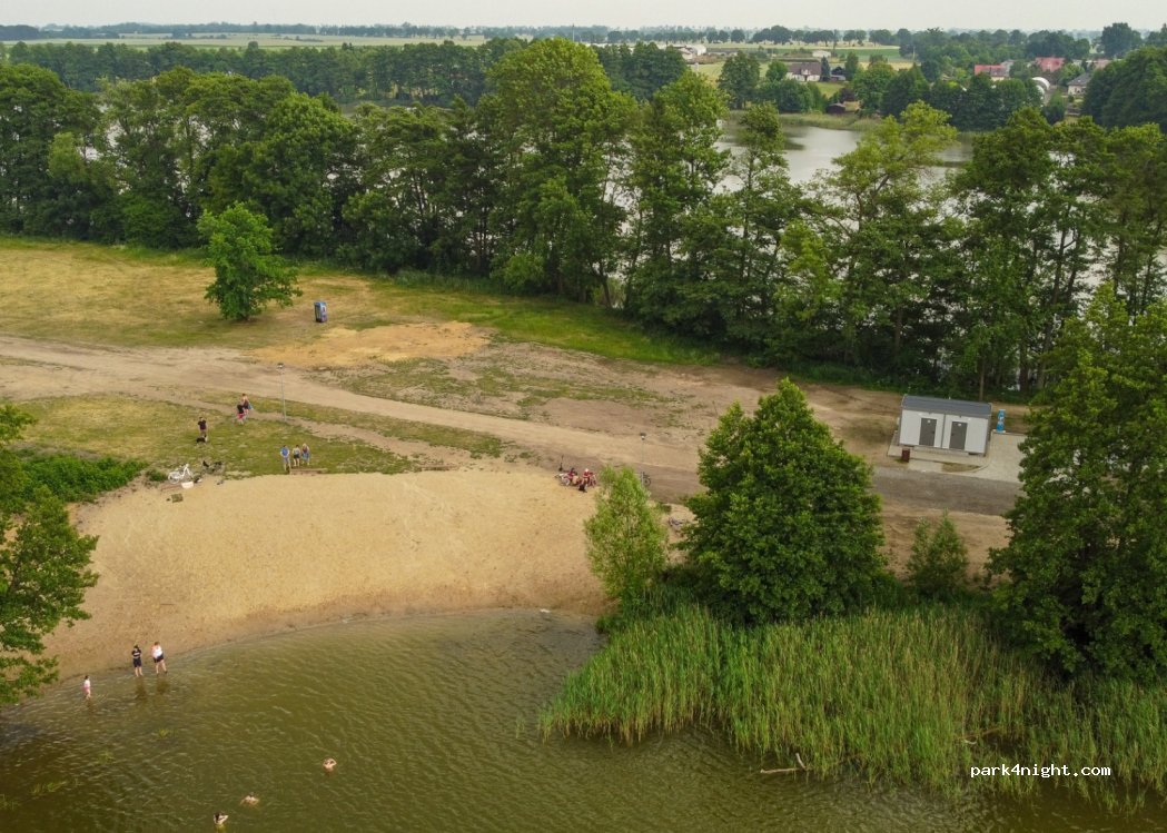 Miejscówka na półwyspie między jeziorami dość dużo wolnej przestrzeni do zaparkowania teren raczej nie równy na miejscu plac zabaw dla dzieci w sezonie miejsce tętniące życiem są toalety słupek i podłączenia do prądu jednak po sezonie konkretnie w lutym brak możliwości zrobienia serwisu a liczyliśmy na to będąc tu przejazdem