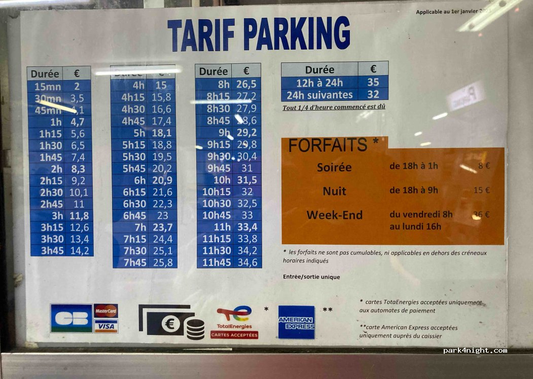 Parking público 24 Hr. que puedes entrar con Furgo Camper si tienes menos de 2,10m. altura , lugar perfecto para aparcar por un precio normal , cercano al centro de Paris , mirar bien la ubicación por qué hay varios , este se llama Parking Maine Montparnasse.