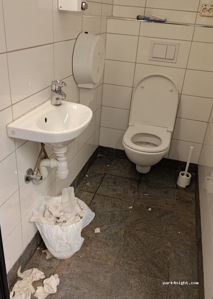 De verwachtingen waren al laag, geen probleem voor een parking dichtbij de stad. Maar wat is het smerig hier. Douches ruiken naar urine en toiletten worden niet schoongemaakt.