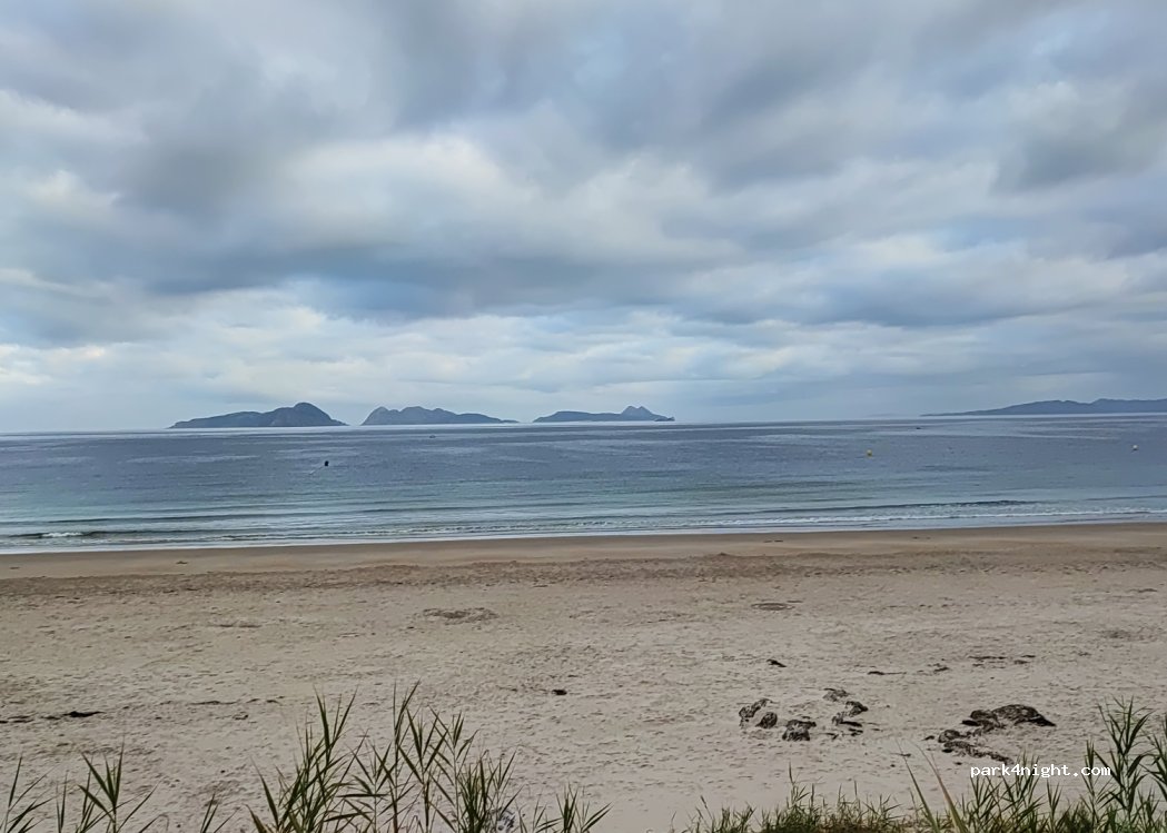 Sin sombra, pero está bien el parking ya que el lugar tiene pocos aparcamientos . Vistas espectaculares de las islas cíes y playa muy agradable , pasamos dos dias geniales
