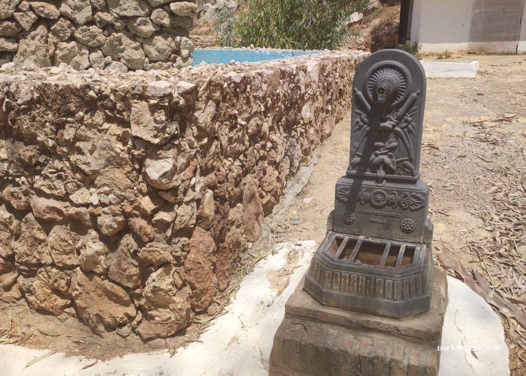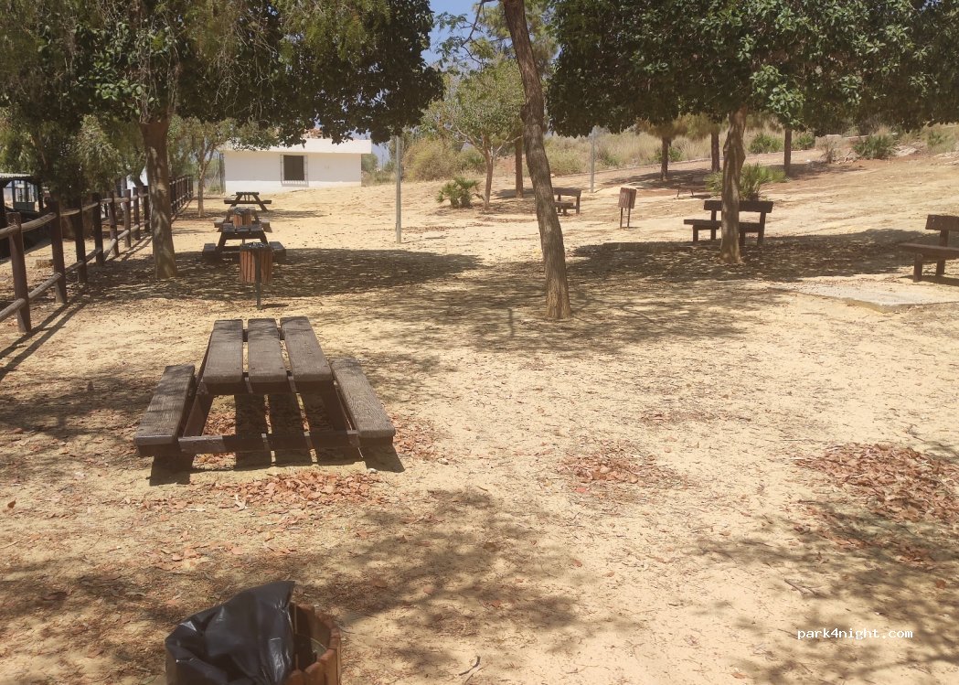 Pequeña zona de picnic junto a la cueva del tesoro con bancos a la sombra y cubos de basura. Una fuente está presente pero fuera de servicio por el momento otras fuentes junto a la cancha de baloncesto, área de juegos para perros.