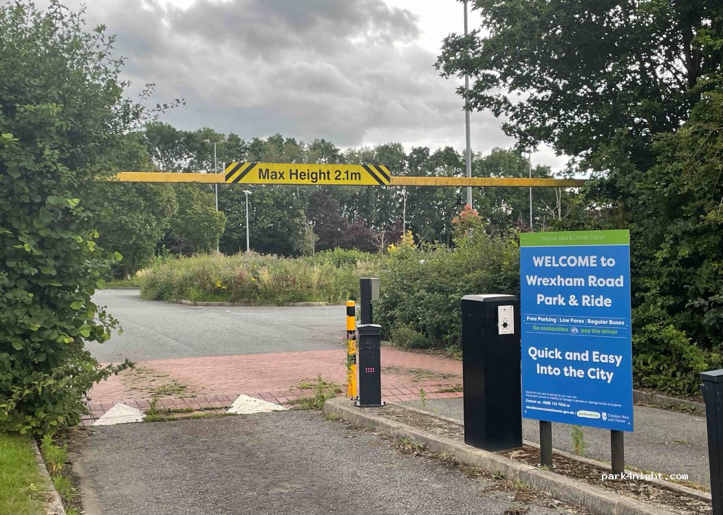 Wrexham Road car park one of Chester's free car parks with paying bus service (£2) from the city centre. Despite the 2.1 m limit, it is possible to park in a section where the barrier remains up. There is an over height area for motor homes before main car park.