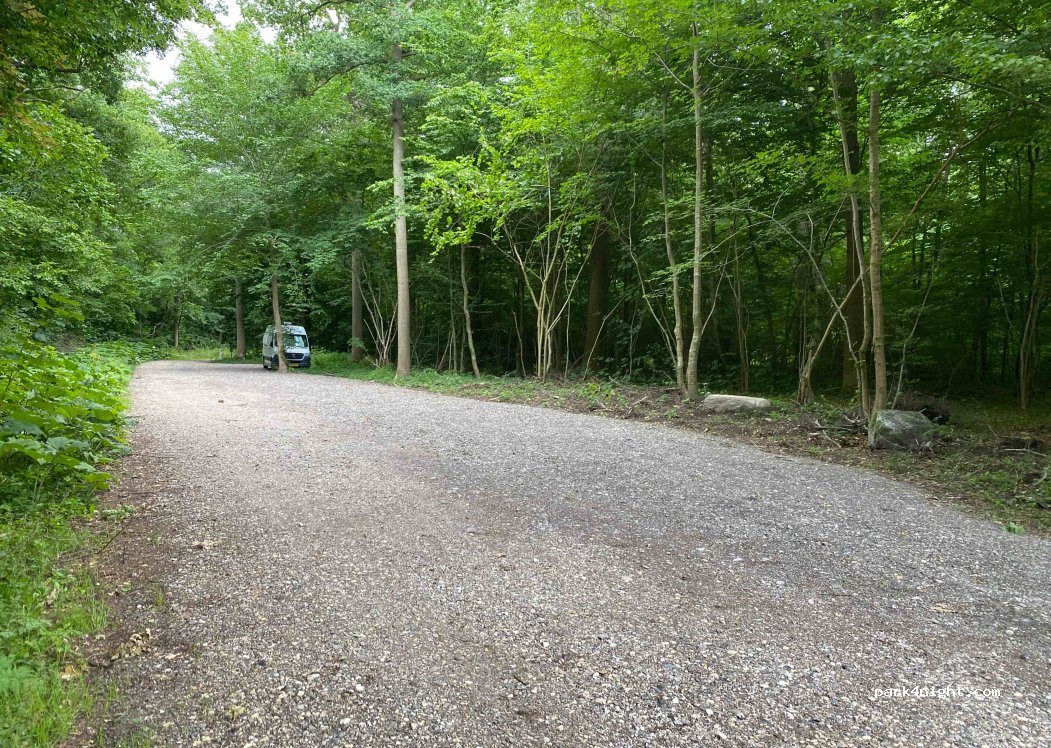 Parking on the side of a quiet road with space for 4 motorhomes and a trash can. Lots of trees surround the area to provide shade and privacy. Walking distance to nearby town which has stores and restaurants. Spent one night here and loved it.