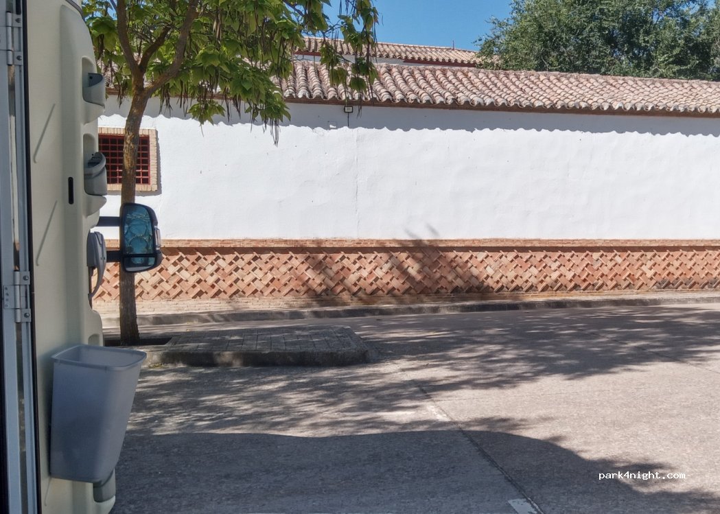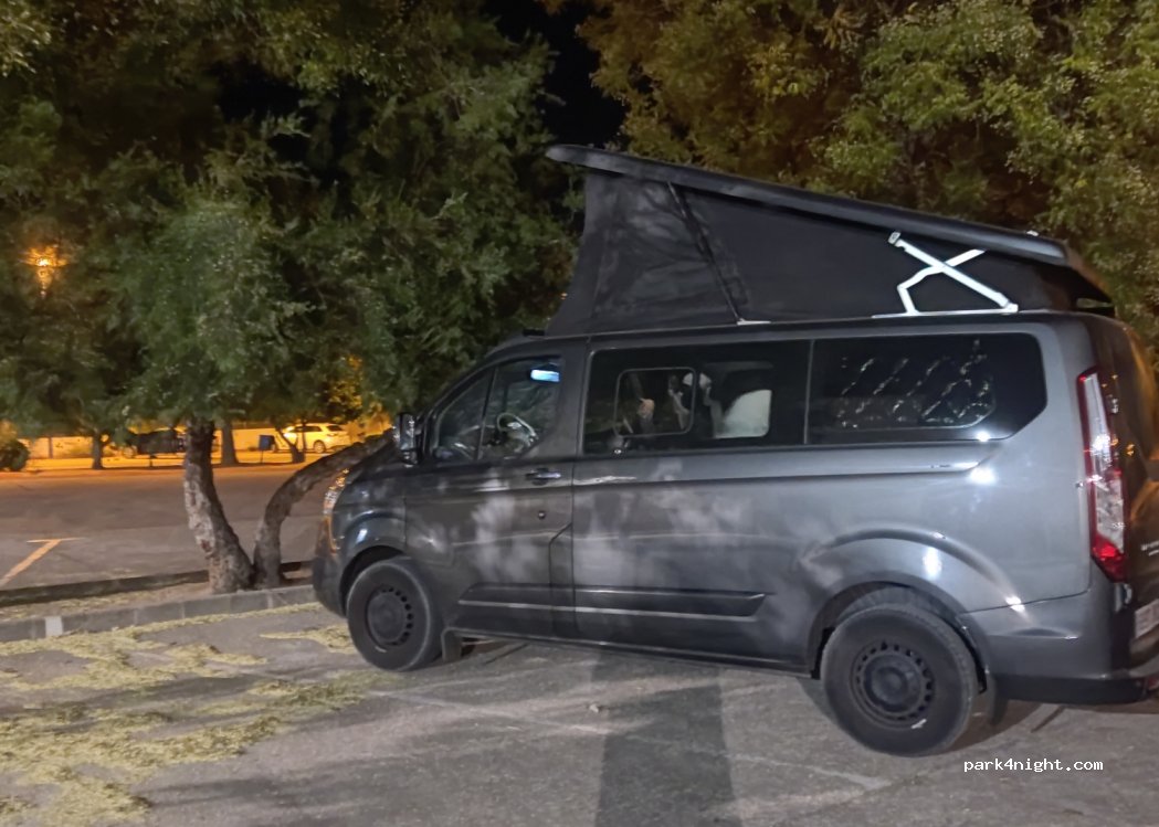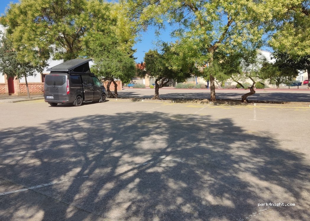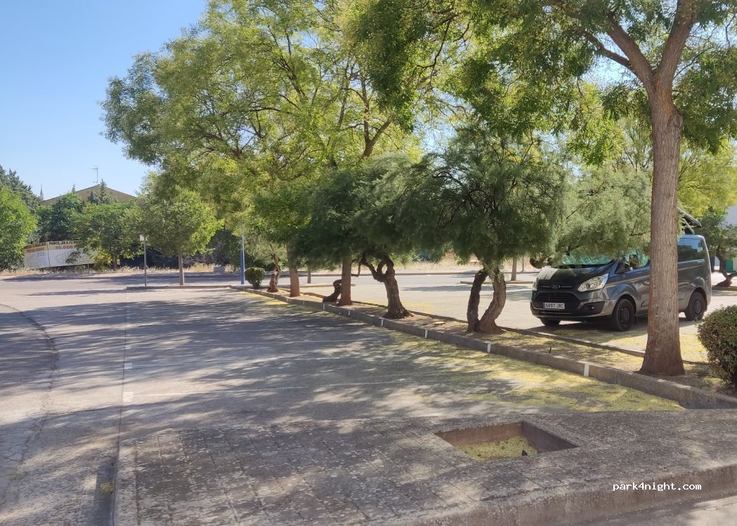 Day and night parking in the parking lot of the bullring. There are 70 places, many with shade, but BEWARE! Only for a van or Camper since the parking lots are on battery if an AC is installed it would come out a lot from the back, we were sleeping on Friday, July 21, 2023 and we were great, there is lighting, a lot of shade and a quiet place to spend the night.