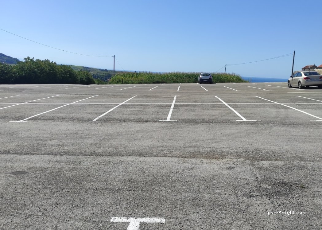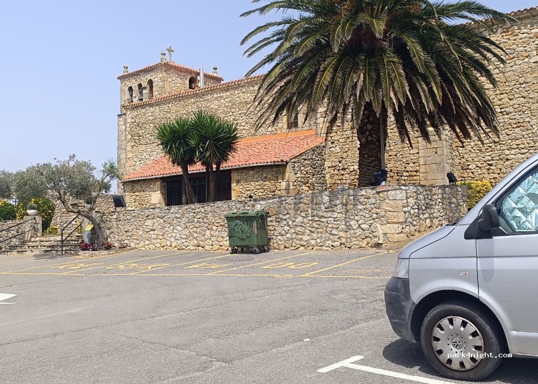 Lugar tranquilo de asfalto para pasar la noche. Al lado de una iglésia. Con vistas verdes a los campos de maíz y al mar. Con fuente y contenedor (para poder mantenerlo igual de limpio que está).