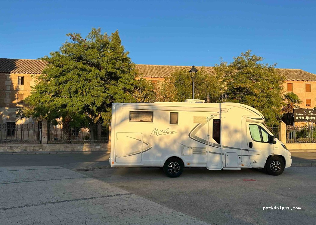 Parking de coches gratuito, frente a parque infantil, a 5 min caminando de la plaza y patio de comedias. Sitio tranquilo. Hemos pasado la noche con la Camper sin problema.