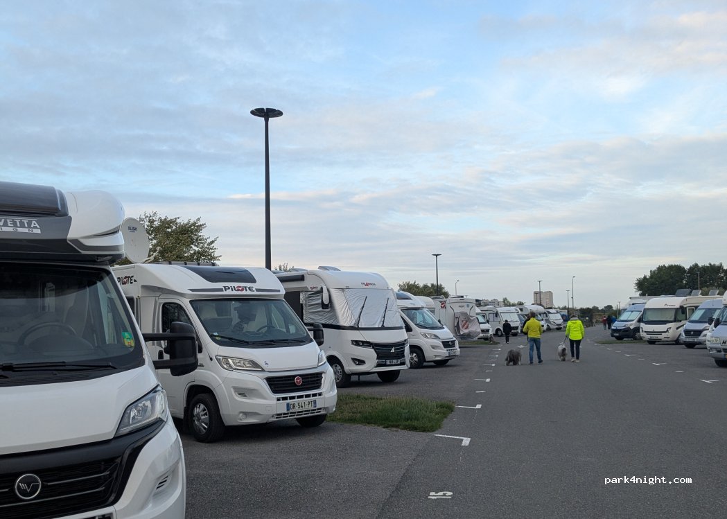 Aire sur bitume, grands emplacements très bien pour visiter la ville et se promener sur la digue promenade. Bus gratuit, l arrêt bus est à 100m. chiens acceptés dans le bus, gros chien avec muselière