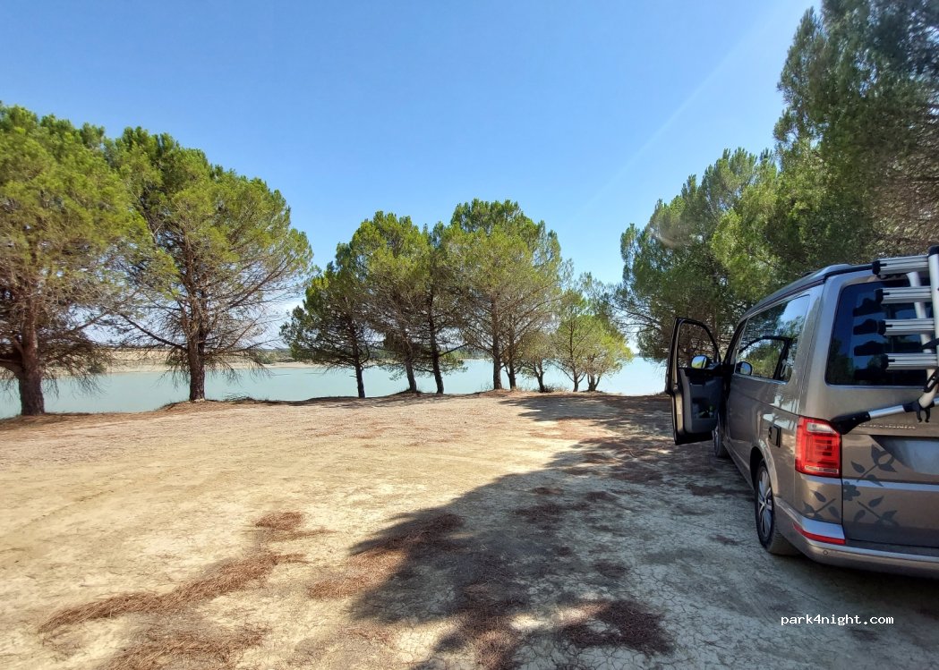 Esplanade neben dem Stausee, nur Mülltonnen. Wir sind mit einem Wohnmobil mit Profilhöhe 2,90 hineingefahren, die Zweige der Kiefern berührten ein wenig. Ich nenne übrigens einen sehr sehr ruhigen Ort mit Schatten. Wir waren morgens und abends halb so. Es gibt keine Bars bzw Geschäfte.