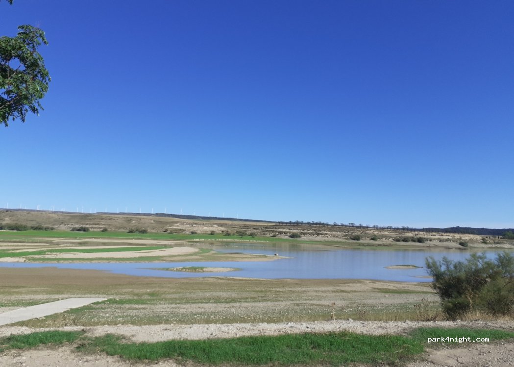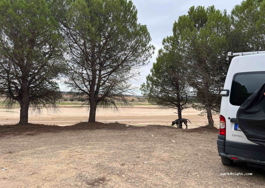 Explanada junto al embalse solo cubos de basura entramos con autocaravana perfilada altura 2,90,rozaban un poco las ramitas de los pinos.camino llamo,con sombras lugar muy muy tranquilo estuvimos media mañana y noche.no hay nada de bares ni tiendas.