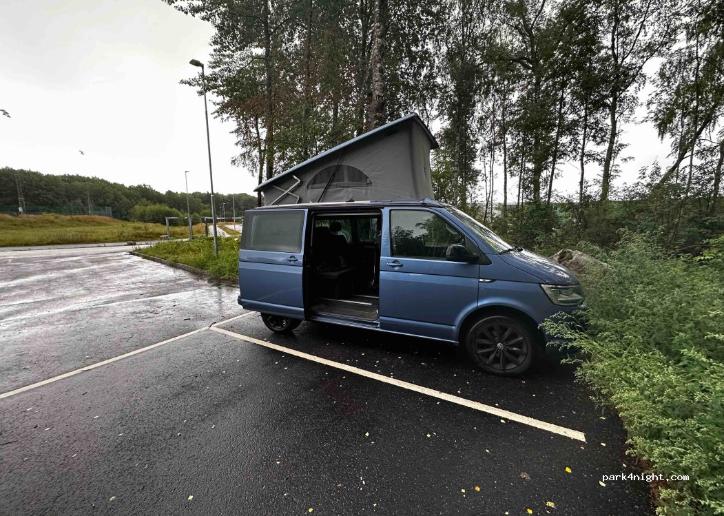 Höhenbegrenzung auf 2,1m. Hatten eine ruhige Nacht. Am morgen wurde es lauter, als die ersten Autos kamen und eine Kehrmaschine den Platz reinigte. Für eine Nacht auf der Durchreise mit einem niedrigen Van ok.