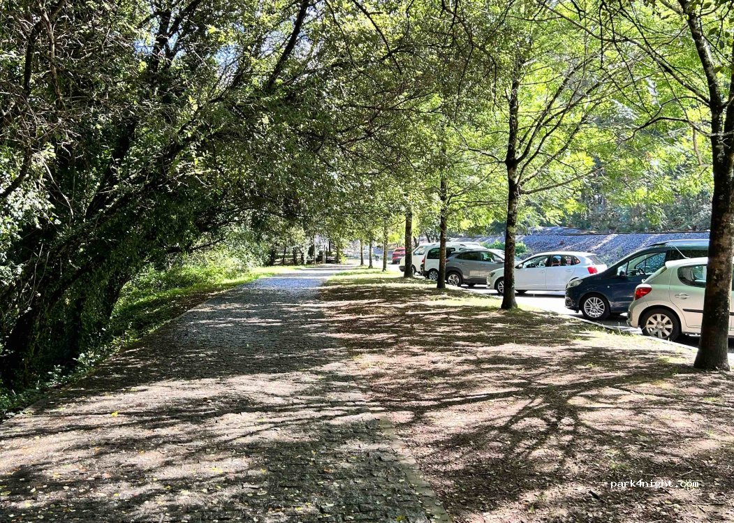 Parking to visit the Torres do Oeste. Next to the train track. Dead end road with shadow.