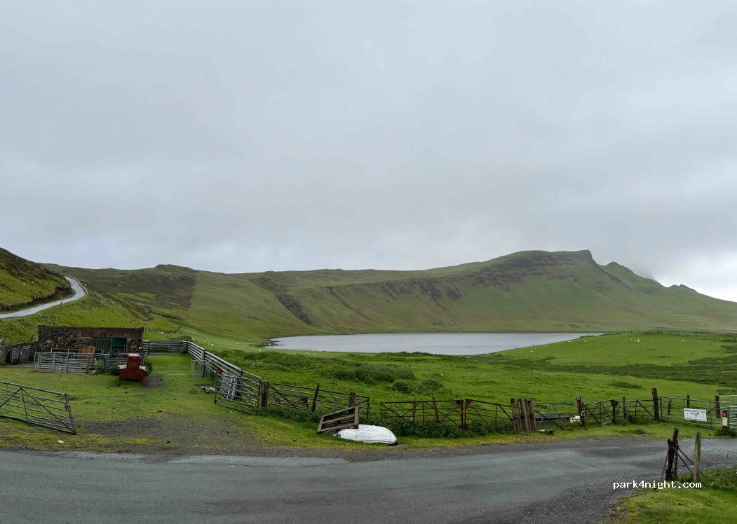 Buen sitio para dormir, espacio para unas 3 autocaravanas/campervan. No hay señal de móvil, aunque subiendo un poco dirección a Neist Point se encuentra. Lugar tranquilo con las ovejas al lado, pasaron literalmente entre los dos vehículos que estábamos aparcados como si no hubiese nada, y caminan tranquilamente por la carretera.