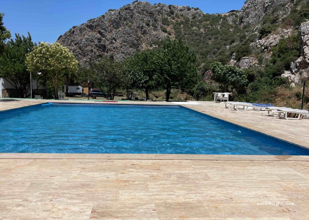 Шикарный кемпинг , отдали за сутки 400 лир и по 50 лир с человека за бассейн, пляж песчаный в 3х км от этого места . Бассейн большой и чистый !