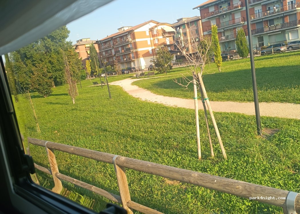 Parcheggio sul retro del supermercato. Tranquillo, con piccolo parco accanto. Molto vicino al negozio (Lidl) non lontano dal centro città. Abbiamo usato le biciclette per raggiungere il centro.