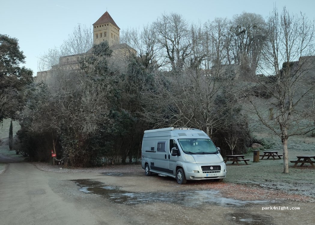 Bellissimo posto per una sosta e per la notte. Tranquillo, a parte le campane che suonano l'ora. Un breve percorso pedonale porta in paese (molto piacevole) con vista sui Pirenei. Ottima la boulangerie.