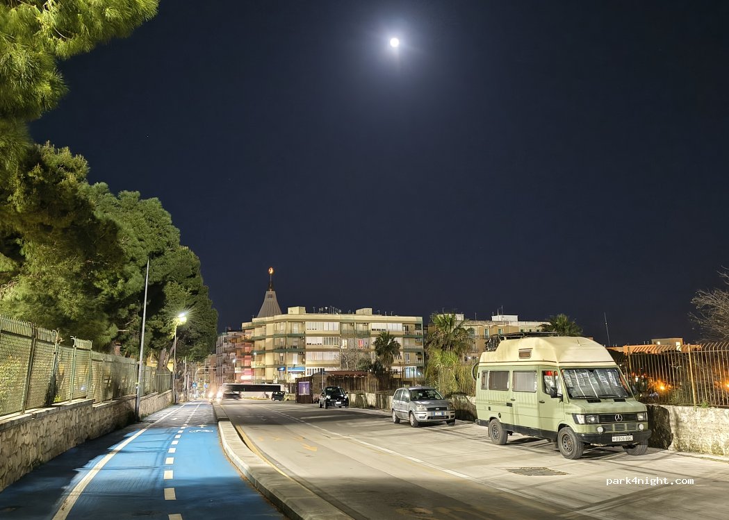 Parking spaces next to the archaeological park of Syracuse. This place was recommended to us by some inhabitants near the port, restaurant and others. No payment because white area. Look well at the marks on the ground, to avoid the places of taxi and motorcycle and others. Little structure for motorhomes outside campsites, sometimes closed at this time of the year. Attention come after dark, because more space.