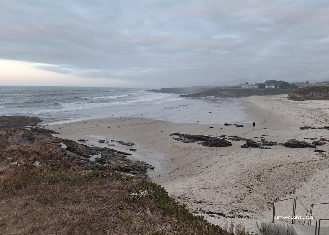Parking devant la plage. Le 8 août nous avons trouvé une place sans problèmes. Il y a des toilettes publiques sur la plage, qui sont bien. Ils ferment à 19h30. Terrain de niveau. Au centre de Foz 30 minutes à pied.