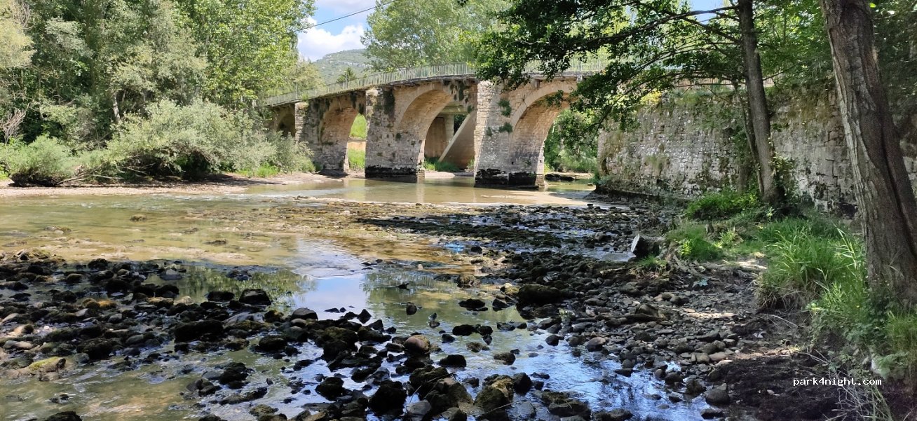Joli lieu au bord de rivière. Pour y accéder, contourner le pont en travaux. Nuit calme.