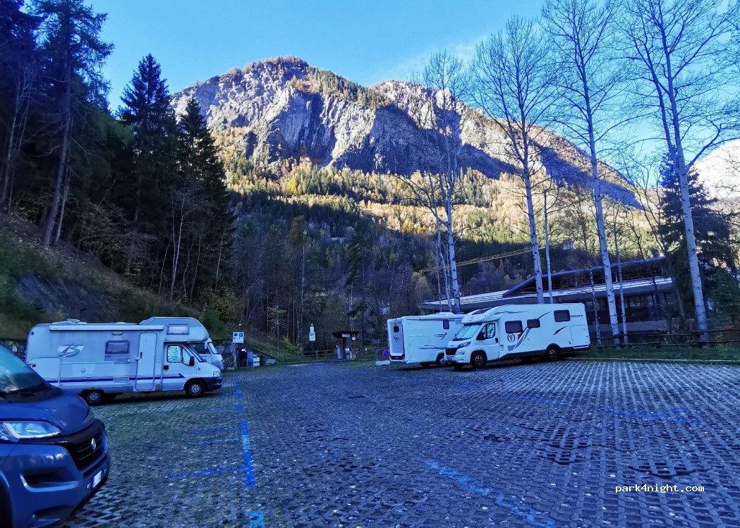 Bon spot pour une ou plusieurs nuits afin de profiter des activités à côté de Pré-Saint-Didier (qc termes,pointe Helbronner....). Pas de wc mais des services pour les camping-cars (vidange,eau...). 3 euros la 1ère heure puis 50 cts les suivantes soit 14 euros 50 les 24h.