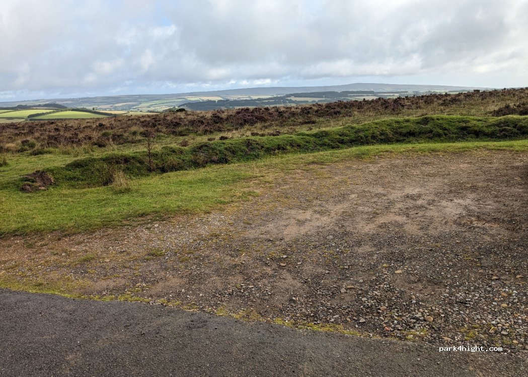 A quiet roadside car park, enough space for 2 camper vans, the road is a bit sloping but has very nice views across Exmoor.
