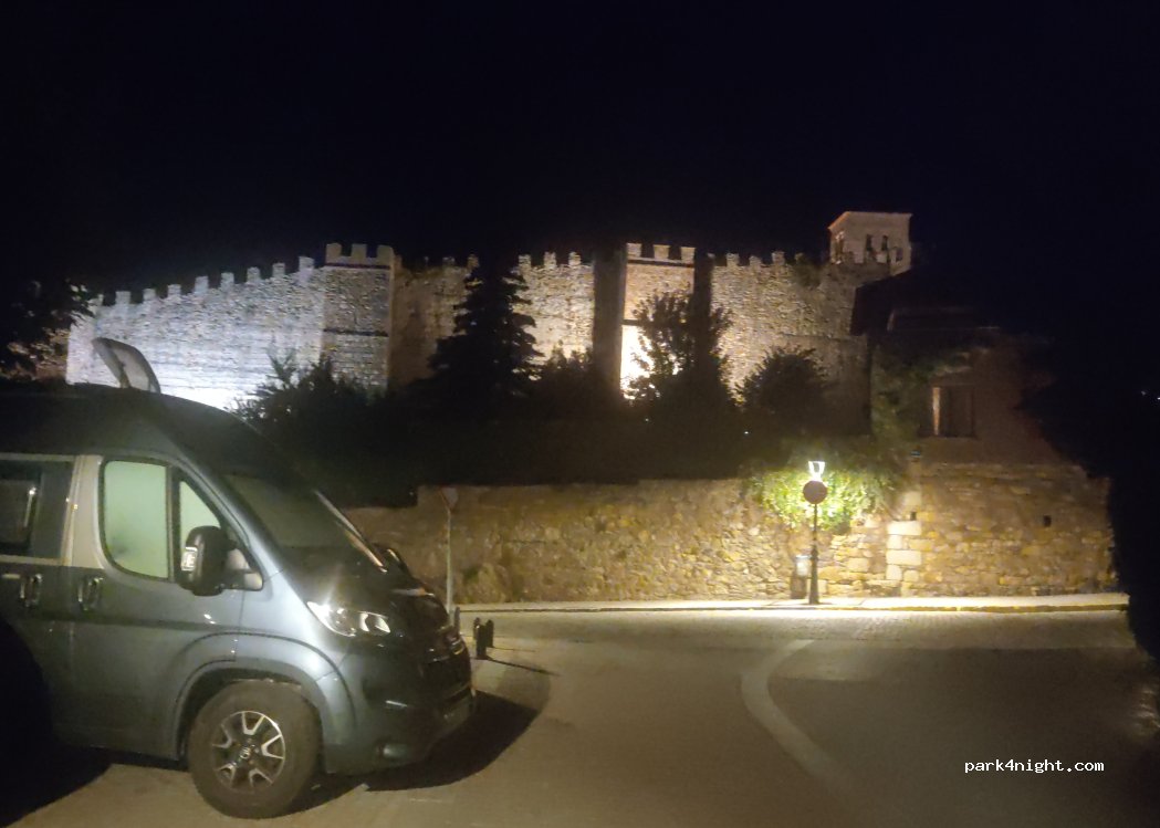 Bonitas vistas al río, a la muralla, castillo e incluso a la iglesia. Bien nivelado y con capacidad para unos 6 vehículos. Ideal para camper máximo 5 metros 40. Muy cerca de la plaza (buenas tapas) y De la Iglesia (pequeña pero preciosa). Punto de partida para hacer alguna de las rutas como la de las murallas. Nos encantó!