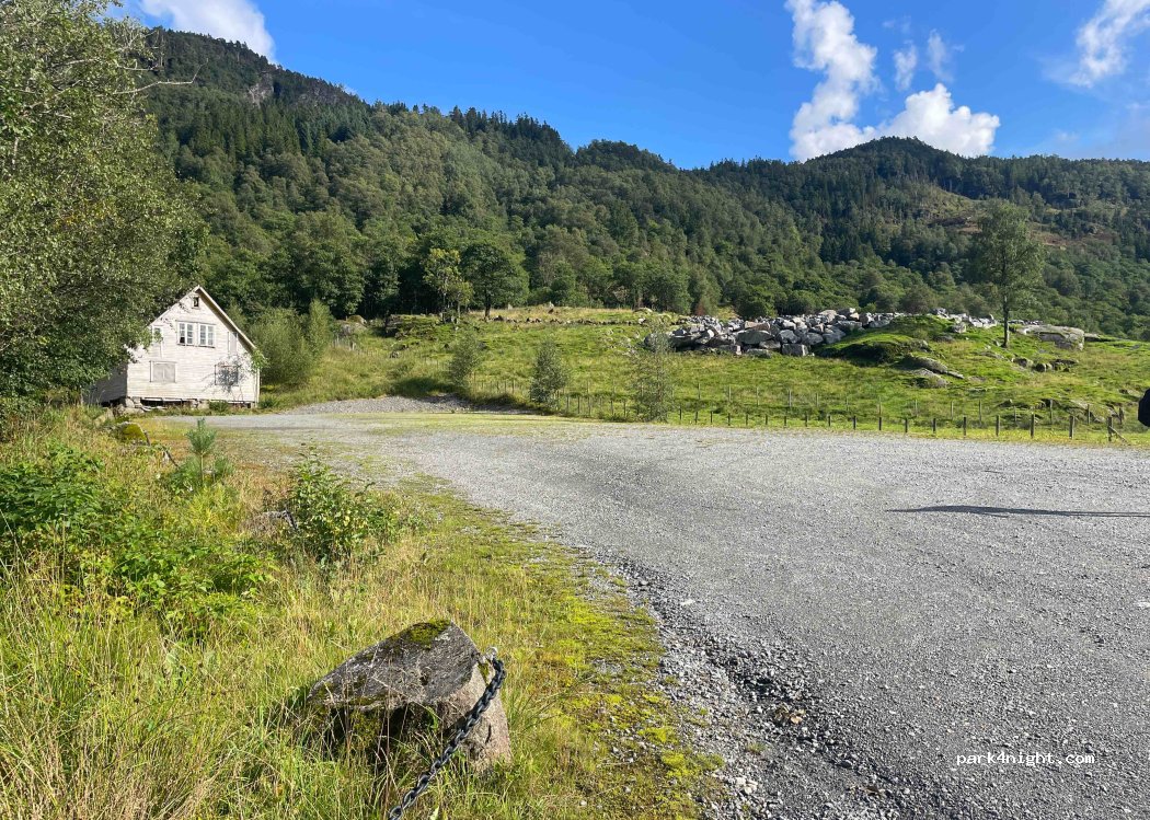 Großer gekiester Parkplatz am Bygdemuseum, neben der Straße gelegen, allerdings nachts kaum Verkehr
