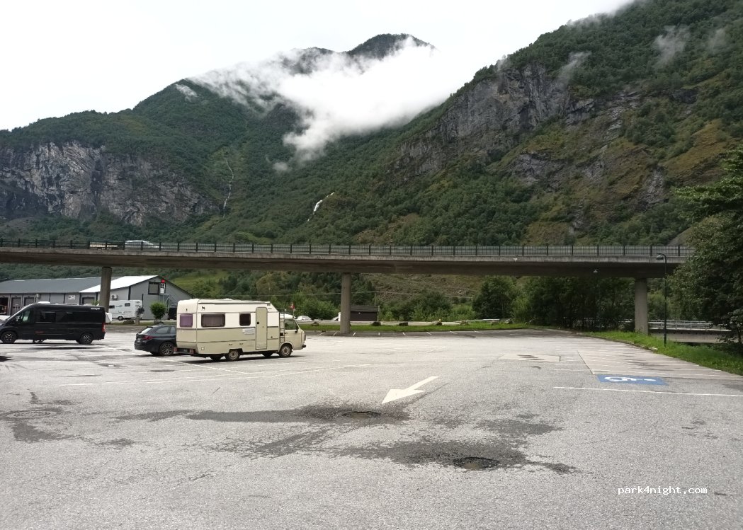 Parking amplio con muchas plazas, aunque todas para vehículos. Aún así se puede aparcar la autocaravana sin problemas. Cuesta 25kr/hora o 220kr por 24h. Está bien situado para visitar Flam y la cascada de Brekkesfossen.