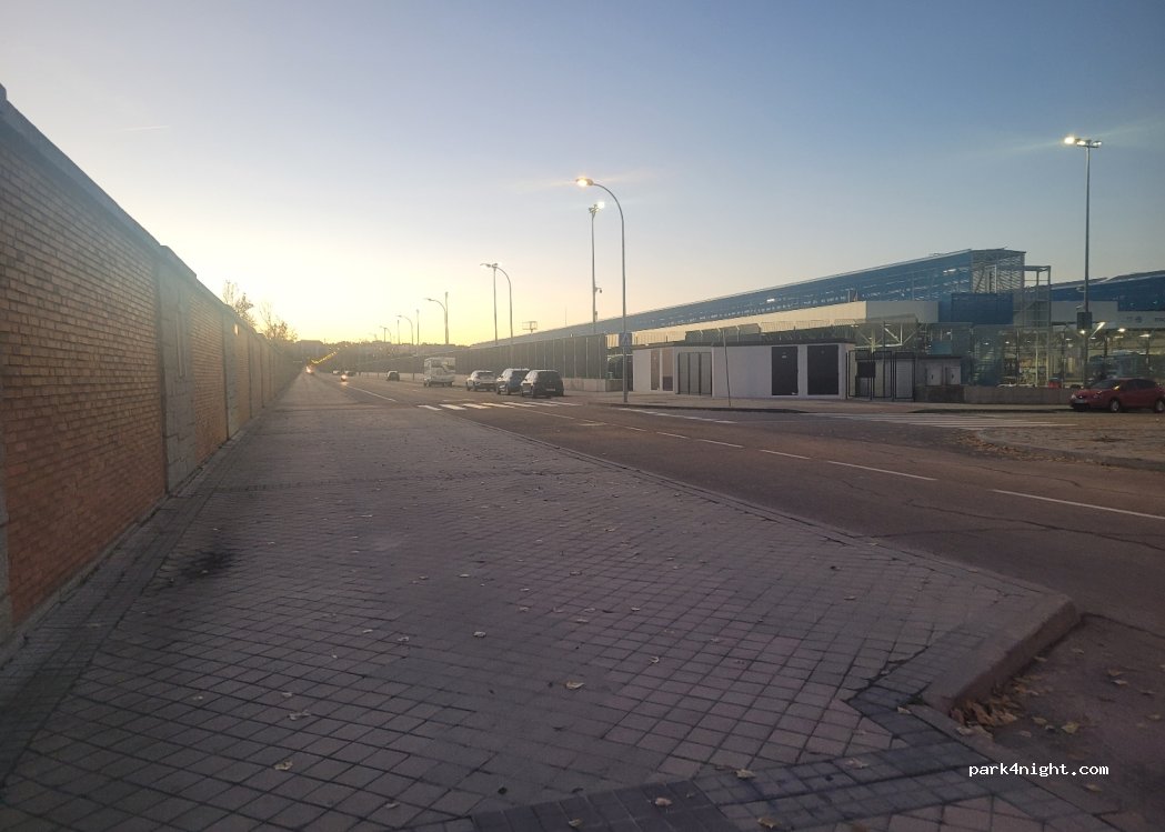 Por la parte de atrás en la calle halconero del rey, hay muchos aparcamiento libre y un parque de pinos, muy tranquilo para hacer noche y día libre de tiempo, ninguna señalizacion de prohibición alguna