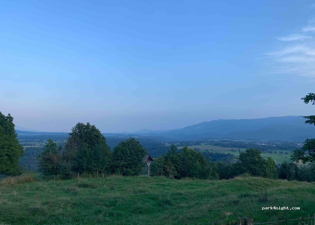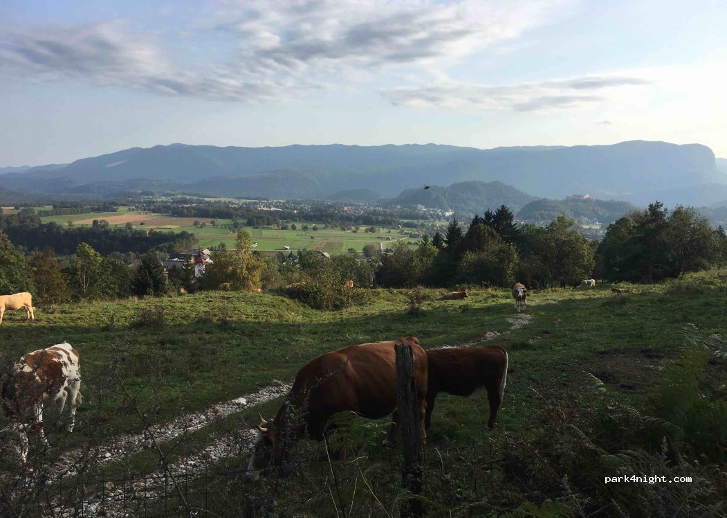 Un parking a las afueras de Bled con una bonita vista pero para llegar hay una subida muy empinada y calles muy estrechas, se puede hacer en coche o con una furgoneta pequeña, no recomiendo ir en autocaravana, hay un bar que abre temprano en la mañana se sirve comida por baño y área de juegos.
