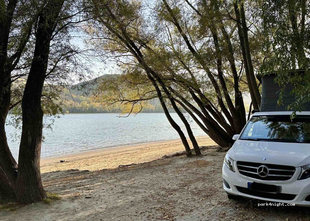 Bonito lugar para dos vehículos a la sombra de los árboles, directamente a la orilla del agua. No hay servicios, solo una chimenea. A 50 metros hay una playa de arena. El lugar es accesible por un camino de tierra bastante empinado, 4x4 no es obligatorio, pero puede ser difícil con un motorhome o autocaravana. Sobre todo porque el camino entre los árboles es bastante estrecho.