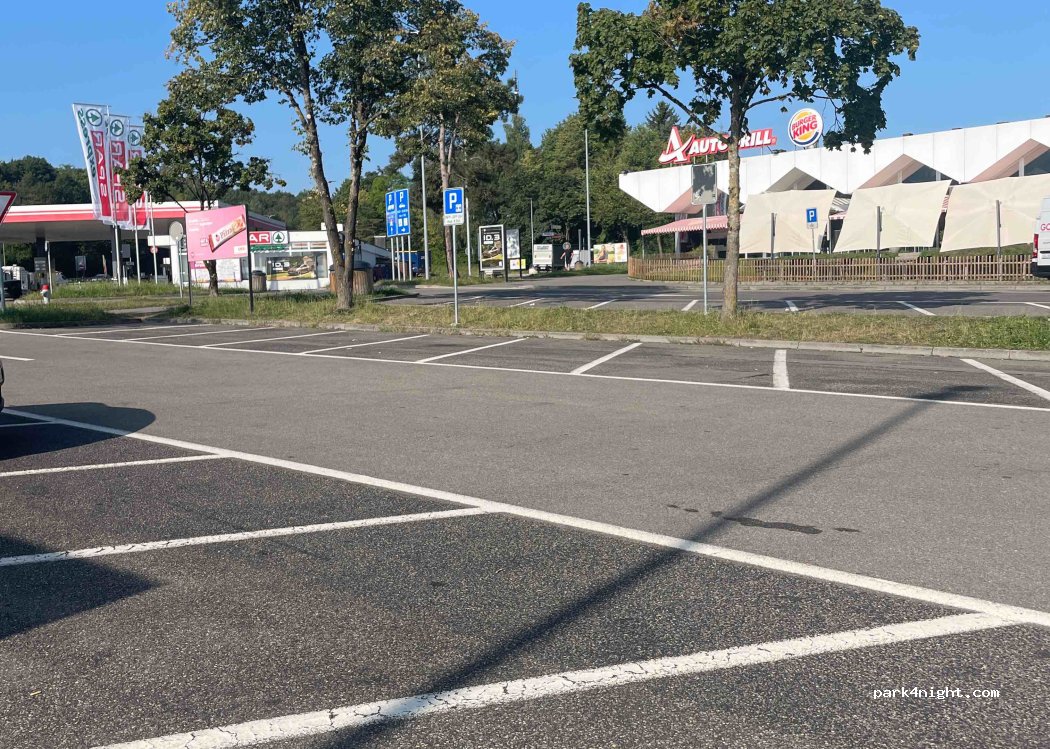 Rastplatz an der Autobahn. Tagsüber 4h mit der Scheibe. Es gibt warme Toiletten und Duschen. Frei.