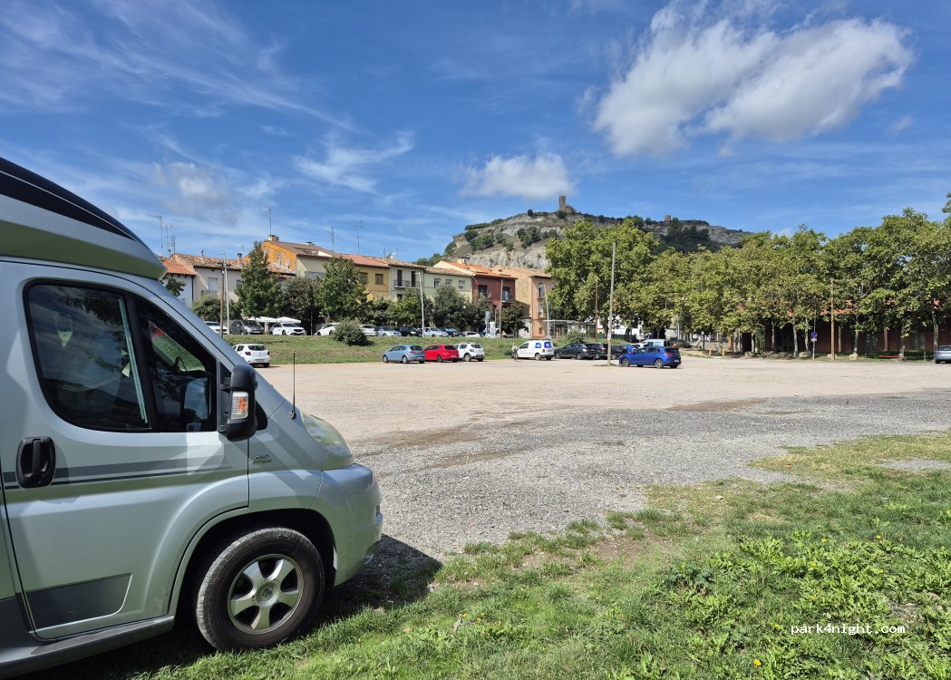 Enorme esplanada de terra on SI es pot pernoctar.Vam trucar a la policia local.Sense serveis ni basura fan el porta-porta.A 5 minuts del centre. Hem anat caminant fins l’església del castell i la torre, desde dalt molt bones vistes. Nosaltres hem fet la volta del turó del castell; no te pèrdua anat pel parc de les Feixetes (dreta) i arribant a L’ermita de Lourdes (esquerre) itinerari molt distret.