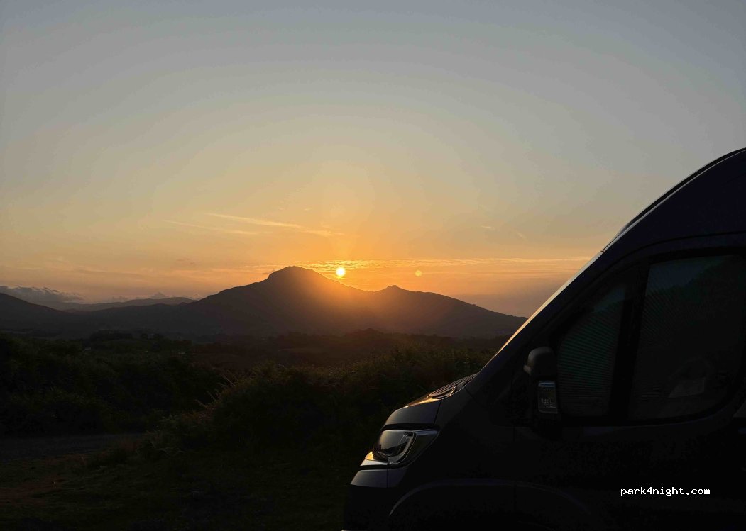 Petit carré d’herbe au calme au bord de la route avec jolie vue sur la montagne, idéal si le parking plus haut est plein ou que l’on veut s’isoler un peu plus. Un peu en cuvette donc pas besoin de cales, route très praticable (nous étions en master L3H2). Les seuls véhicules qui passent sont ceux qui vont stationner en haut donc très peu. Son des cloches des montons, vaches et poneys qui broutent aux alentours. Animaux donc mouches présentes mais le lieu en vaut largement la peine ! Magnifique coucher de soleil sur les montagnes !