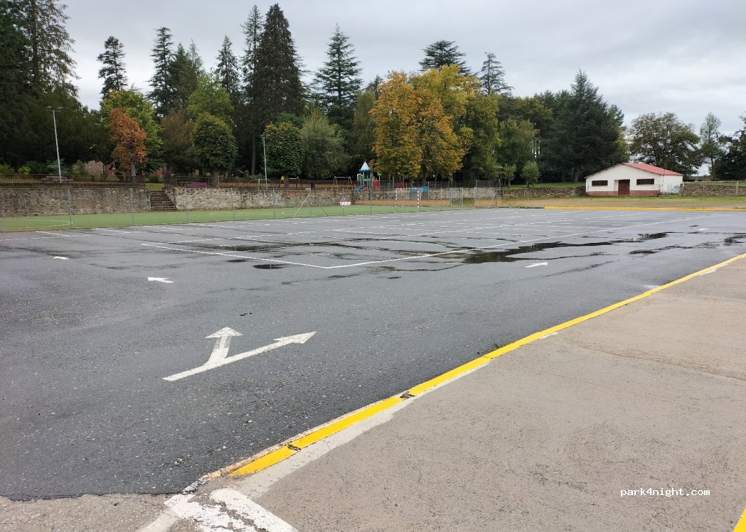 Es un parquing público llano y justo al lado de un parque. En la zona sin alfaltar hay una portería. Zona de restauración cerca. Según nos informan unos operarios que están pintando plazas, van a pintar un pequeño campo de fútbol en la zona que está sin delimitar estacionamientos. Espero que sigan permitiendo el estacionamiento de autocaravanas o habiliten alguna zona, el pueblo es una maravilla.