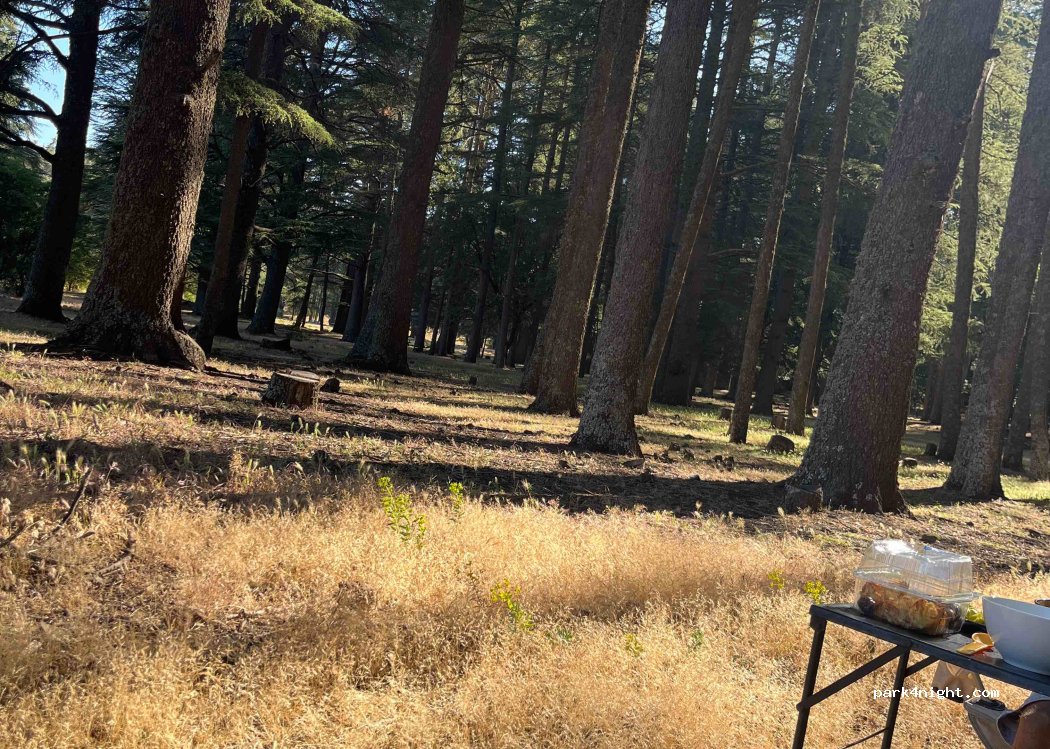 un meraviglioso bosco di cedri per dormire al fresco. proprio di fronte al parcheggio (all'Atlas Park Adventure) potete mangiare una pizza meravigliosa.