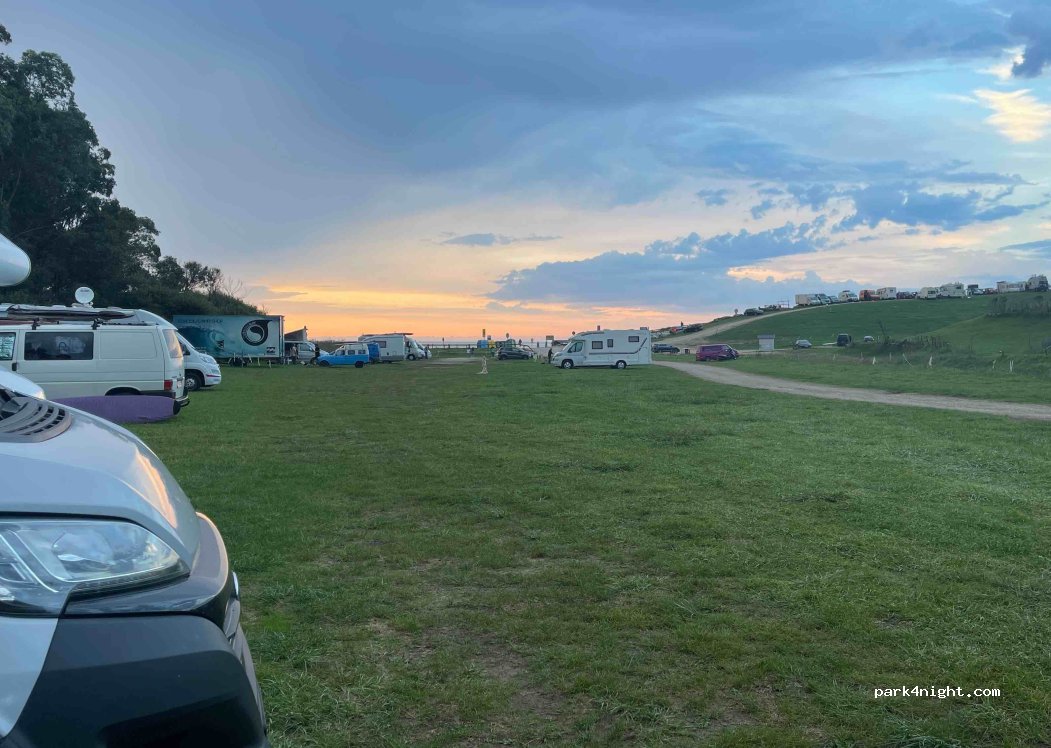 Es un parking de playa en el que se puede pasar la noche. Los 10€ no los cobran por pernoctar, ya que si llegas a las 20:00 y te vas a las 8:00 no pagas nada, el precio es por el día, estés las horas que estés. Es un lugar precioso, súper amplio, a 1 minuto de la playa, muy tranquilo. Es cierto que no tiene ningún servicio, las duchas y baños son los que tiene cualquier playa. Lo recomiendo.