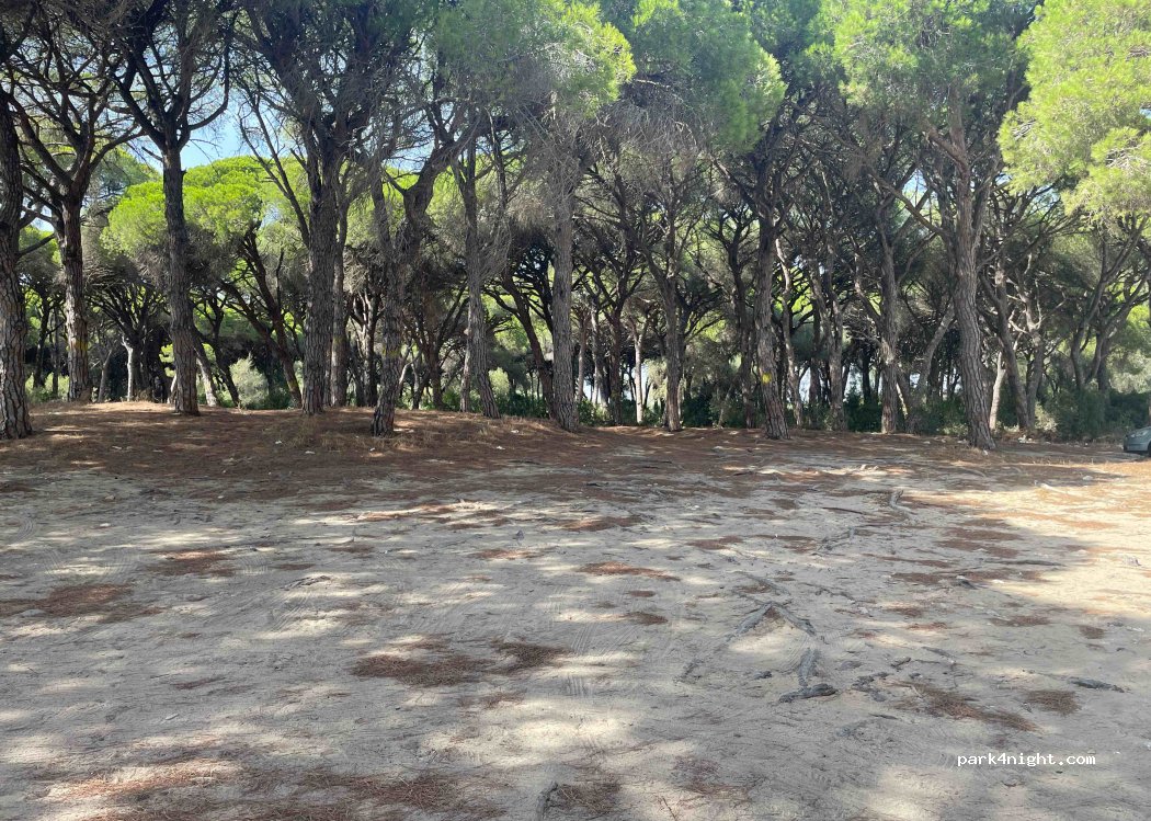 Shady pine forest and parking area in the soccer field area and next to the river promenade. A 15 minute walk from the beach