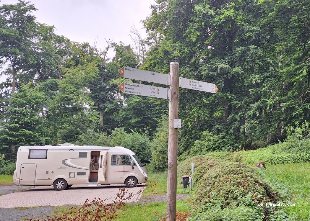 Lovely space in car park beside the Freudeneck community hall. Trees and countryside views beside us. Play park in front, and at least 100m from main road. We stayed on a Friday night in June and had a very quiet night. Nice walks straight from the car park, too. Plenty of space. Many thanks to the community.