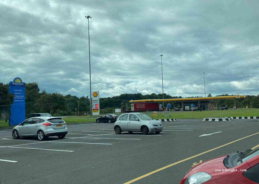 Rest area with free toilets, showers, rubbish bins, McDonalds, Costa Coffee and a Shell petrol station. Free WiFi. £15 for 24 hours