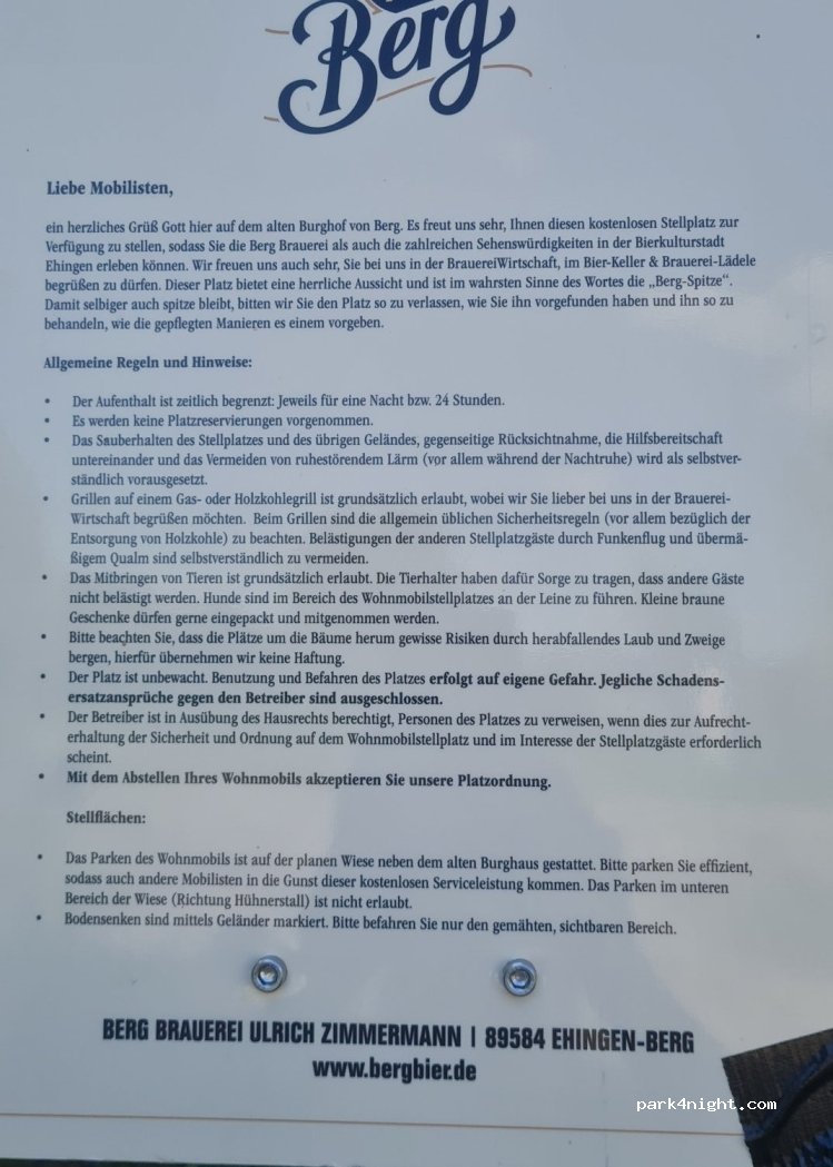 Great fenced-in area of the Berg Brewery, which always holds its events/festivals here. A sign says that you should camp on the streets that are covered with wood chips. I felt very comfortable because it was legal. The Swabian food with delicious beer in the mountain restaurant is recommended. We did the Danube cycle path. I met a camper who was there for more than one night. Of course, beer is brewed at night too and you can hear the beer being produced. You can probably also take a brewery tour.