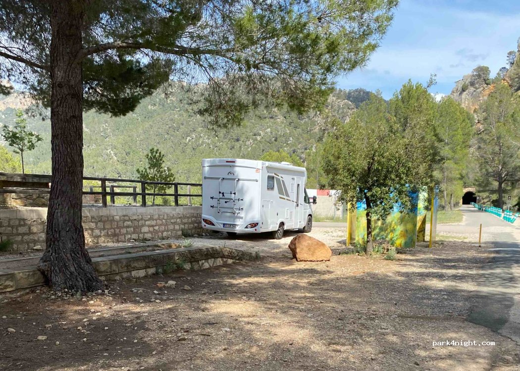 Sitio muy recomendable para visitar Fontcalda que está a 1 km. La zona está en medio de una Vía Verde asfaltada a través de túneles iluminados y puentes. Nosotros hemos pasado 2 noches acompañados por 6-7 ACs, y 3-4 campers. Las noches muy tranquilas con el sonido de los pájaros y el viento. Confirmo que hay muy poca cobertura de móvil.