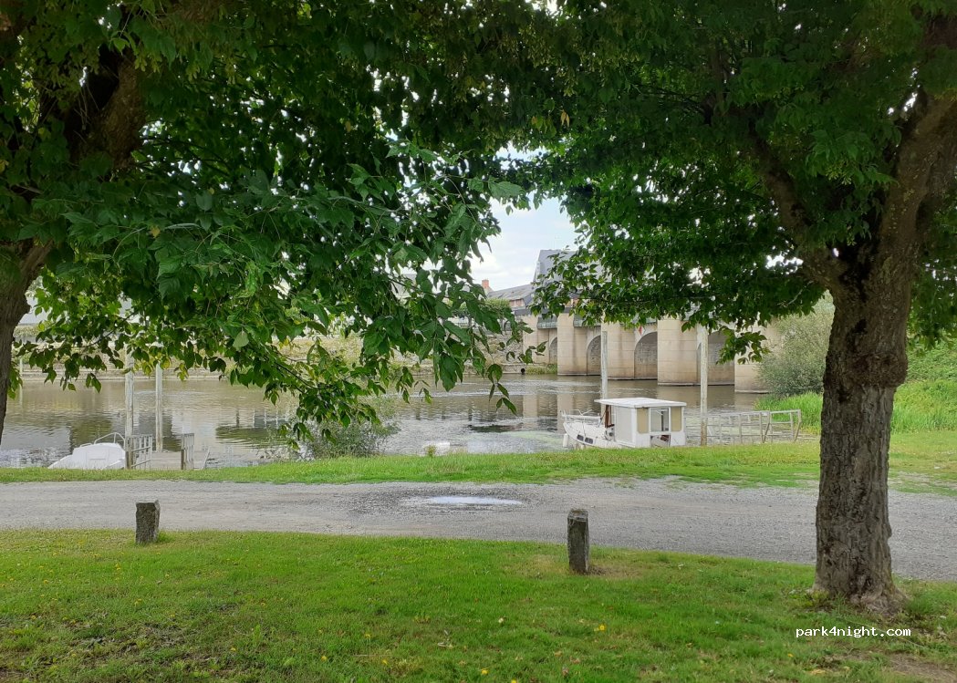Parking gratuit avec tables de pique-nique. Jolie vue sur la Sarthe. Barre de hauteur. Ne pas confondre avec le camping car park qui est payant.