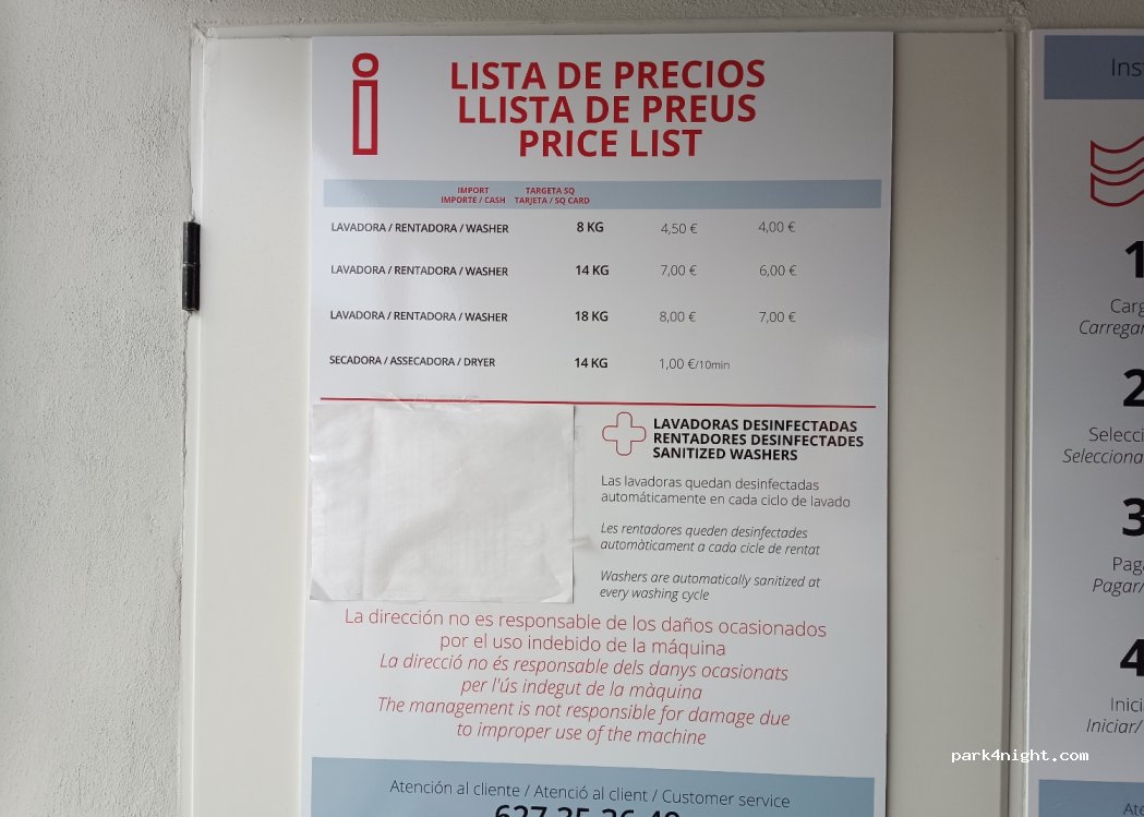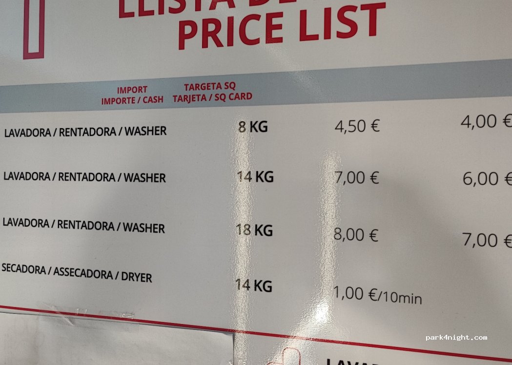 €4.5 for 8kg, €7 for 14kg. €1 for 10min drying. Needed 3 rounds for a completely dried 14kg. Only 4 washing machines (1 for 8.5) and 4 driers and there were locals all the time midday so be prepared to wait for your turn. Good access and parking. Fuel on the way out if you need it. Mercadona next door.