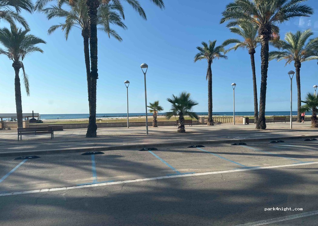 Parking de tierra habilitado durante el día. No se permite pernocta ya que lo cierran a las 21:00 y no permiten pasar la noche dentro. En la acera de al lado (todo el paseo) a pie de playa hay zona OTA (5hrs unos 7€) se permite dormir pero hay inclinación hacia un lateral. Como ubicación, perfecta. Los contras es la incomodidad para pernoctar y que estás junto a la carretera con lo que eso supone.