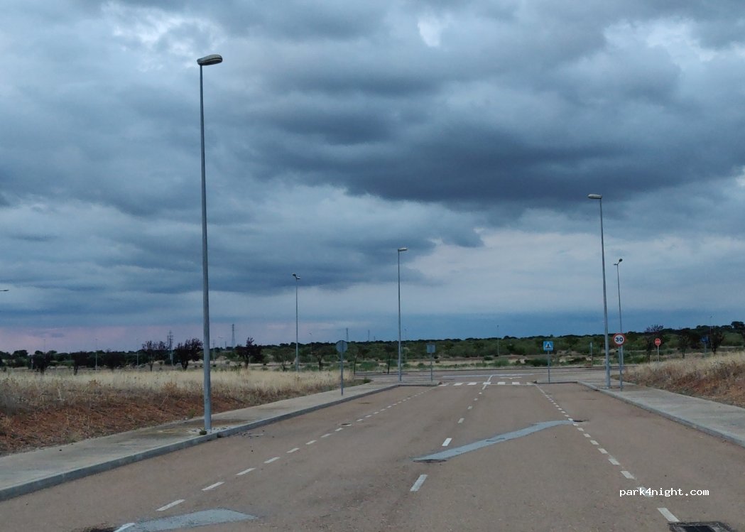 Un parque industrial sin industria (solo hay una que se puede ver en la imagen de satélite). Nada indica que esté prohibido. Parece bastante tranquilo. La autopista está cerca pero no es muy ruidosa. Y las luces de la calle no se encienden por la noche. Me sentí muy segura durmiendo aquí.
